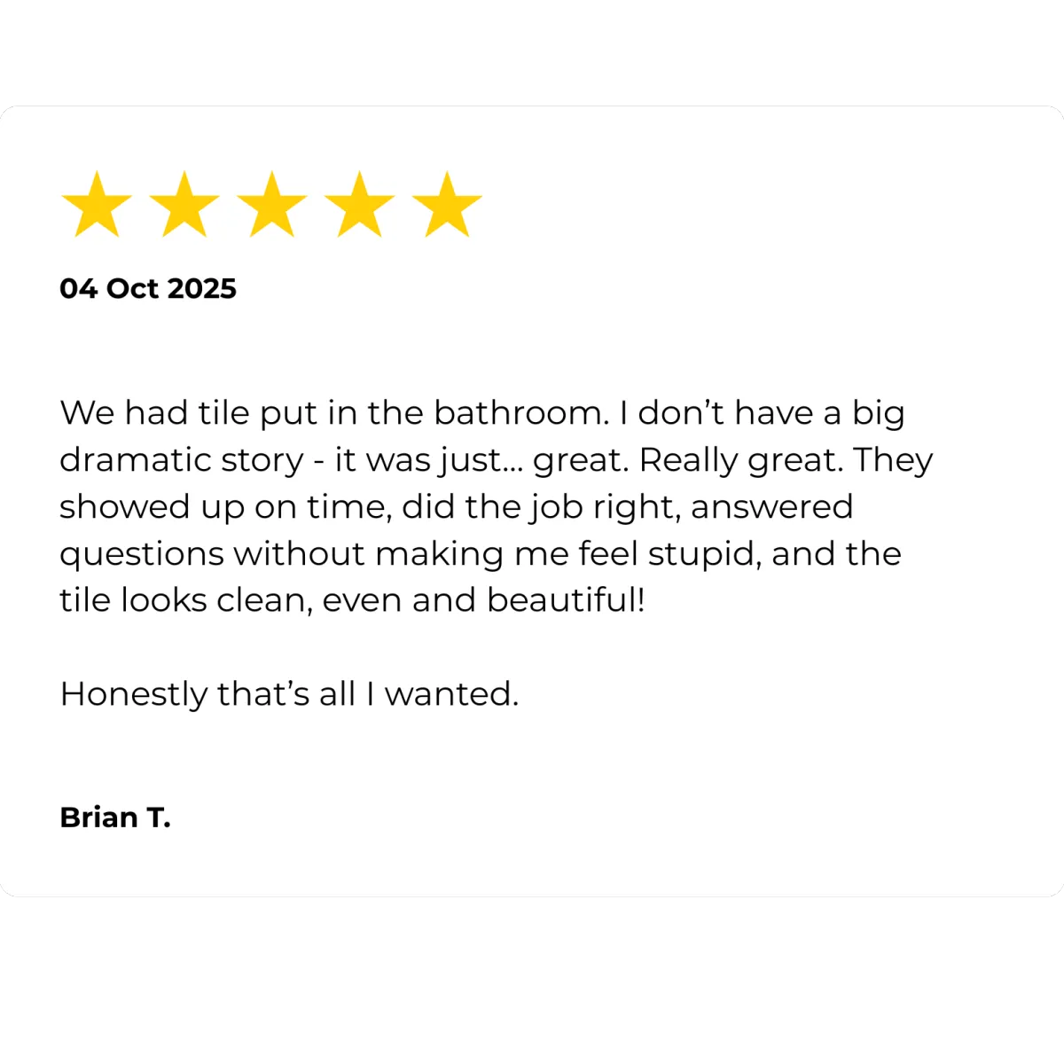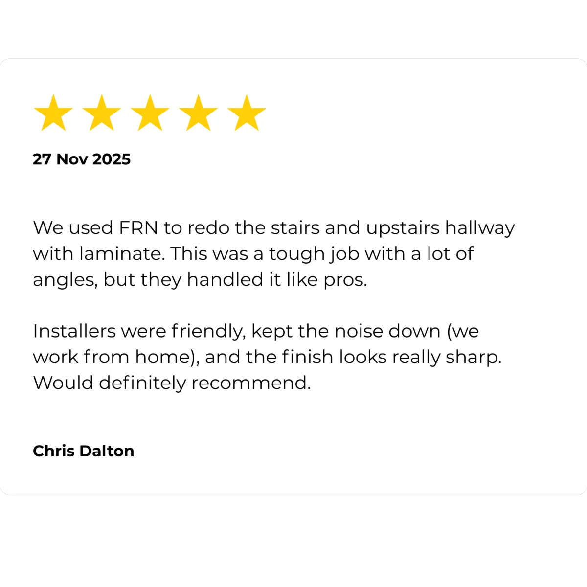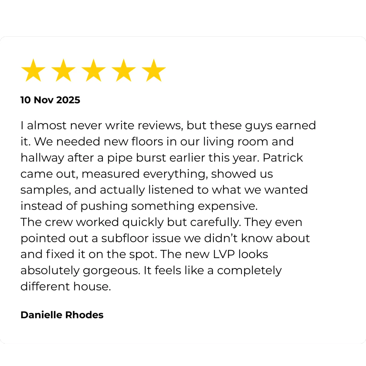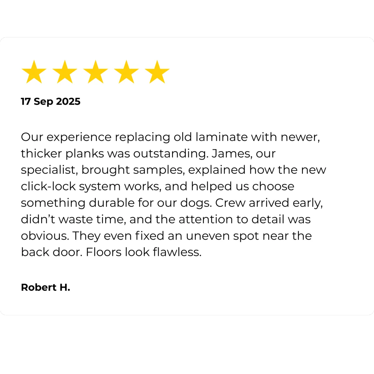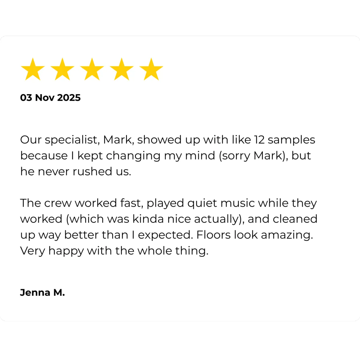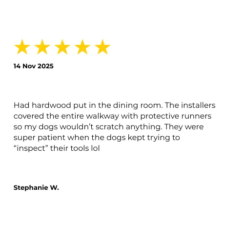 Installation team was quick, respectful, and even vacuumed behind my couch (which I’ll admit was embarrassing). Floors are gorgeous."