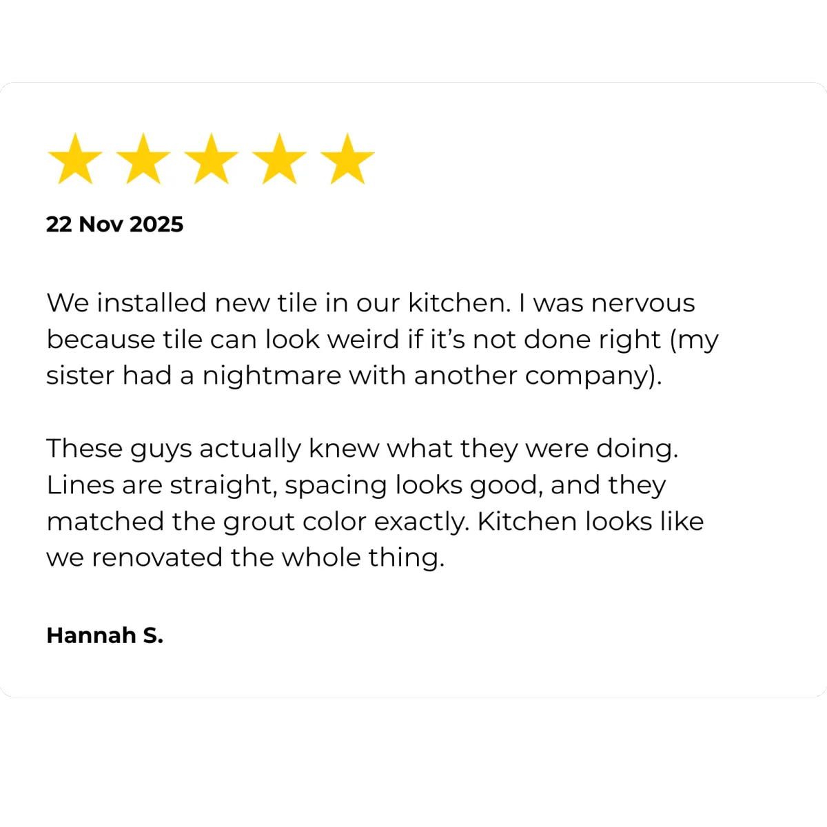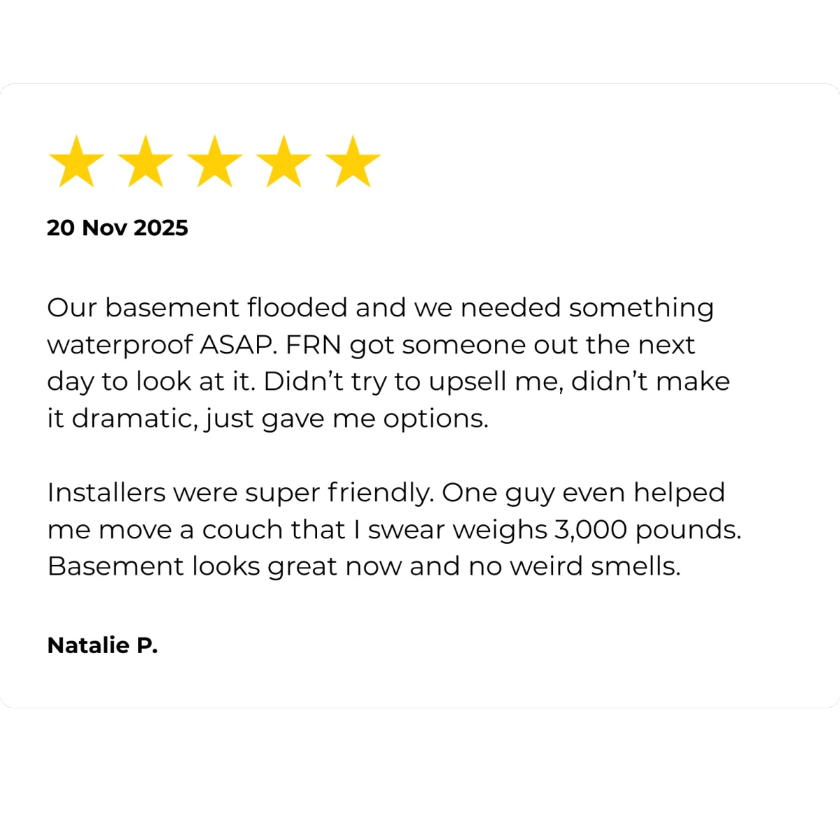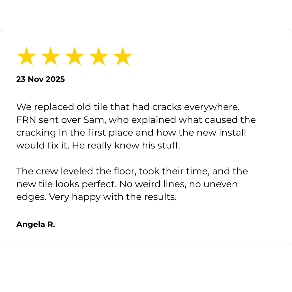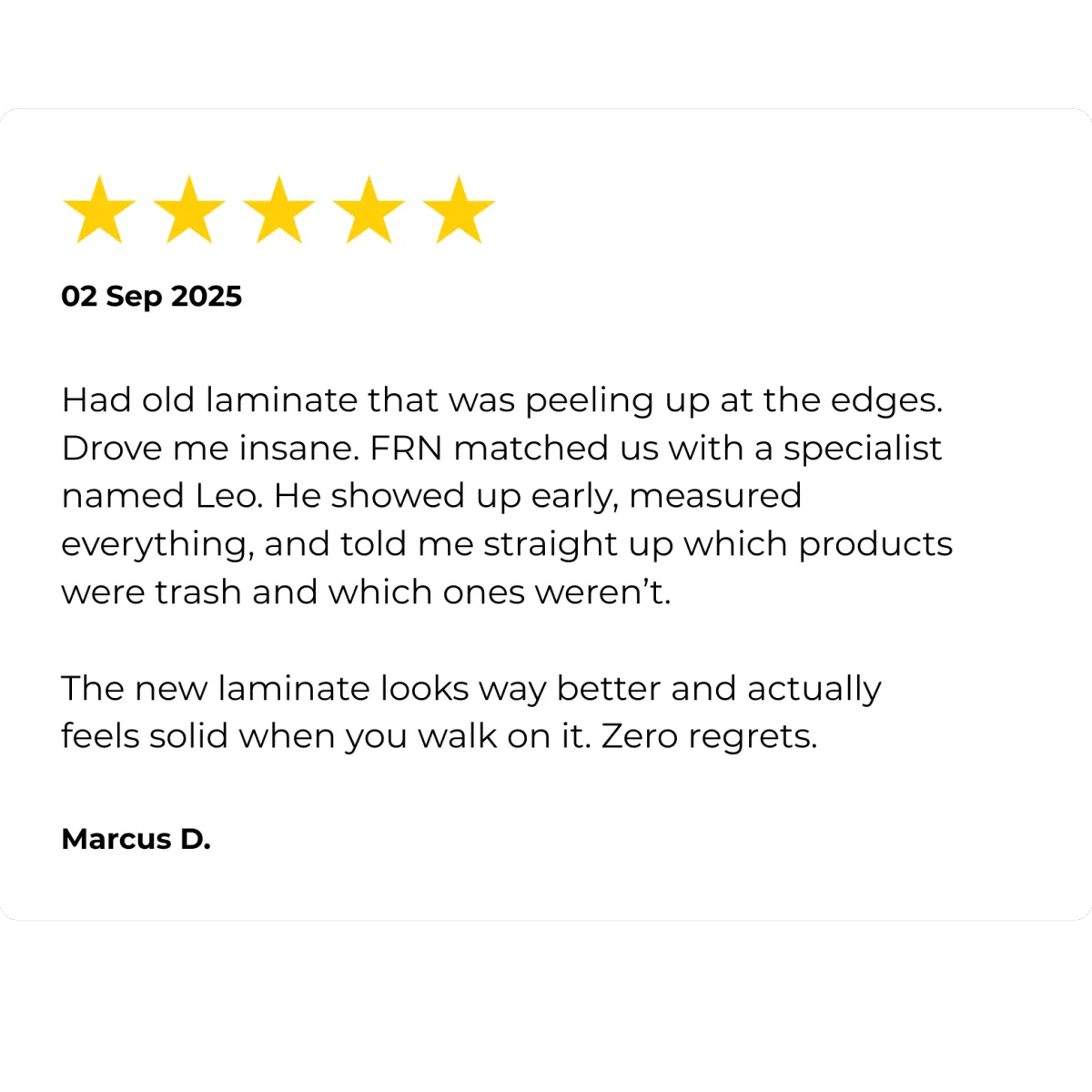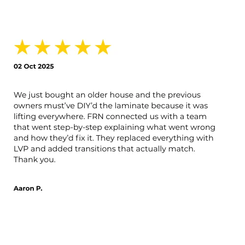 "We had this weird sunken spot in our living room that every other contractor kept ignoring. FRN matched us with a guy named Trevor who actually noticed it before I even brought it up.