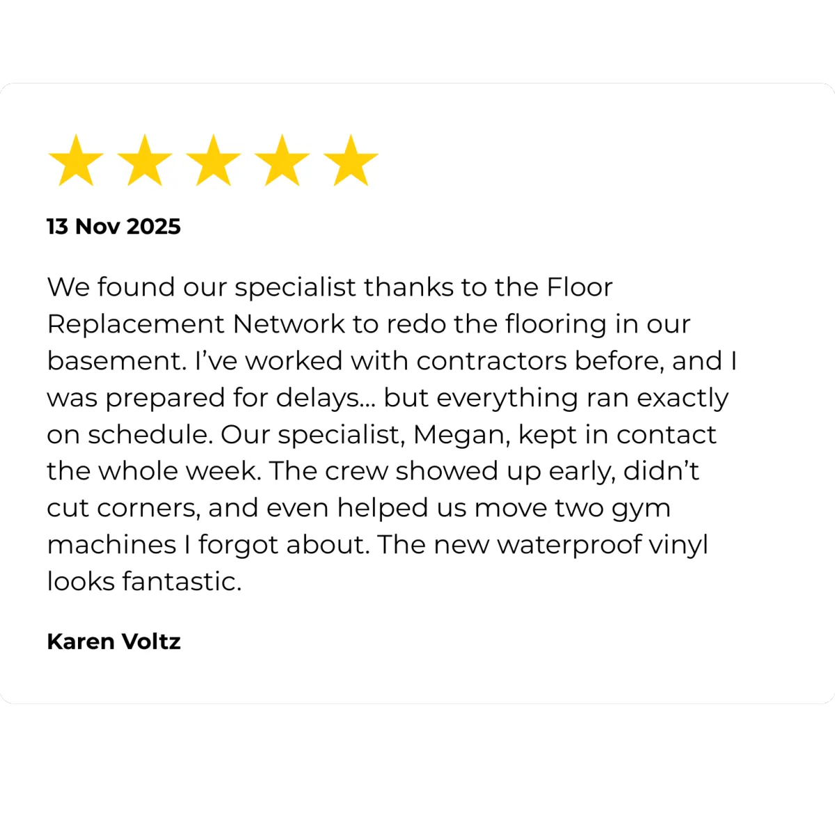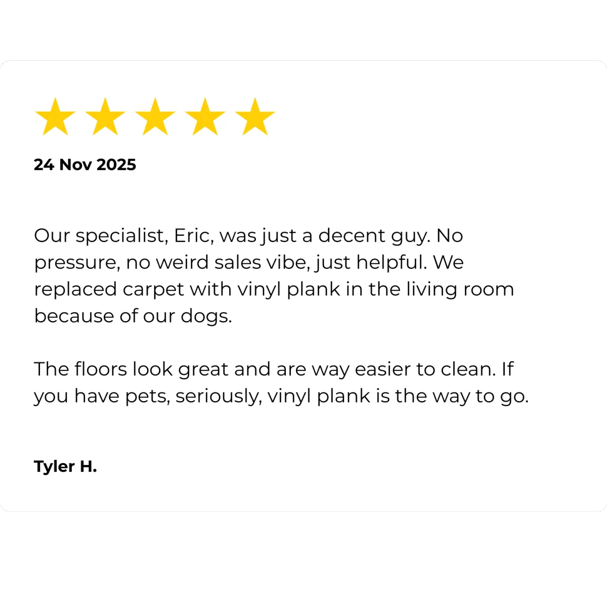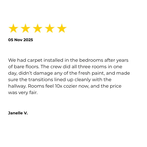 "We had vinyl plank installed in the kids’ playroom. The installers were patient with all the toys everywhere, worked around nap time, and cleaned up better than I’ve seen in years...